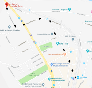 • Entweder zu Fuss vom Bahnhof Baden, dauert ca. 15min. Einfach den Pfeilen auf der Karte folgen 🙂